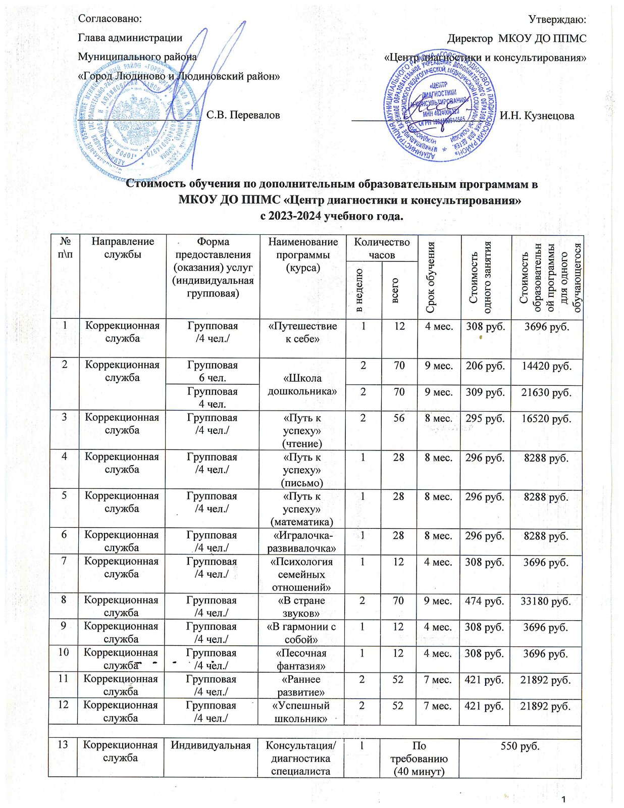 Документ об утверждении стоимости обучения по каждой образовательной программе